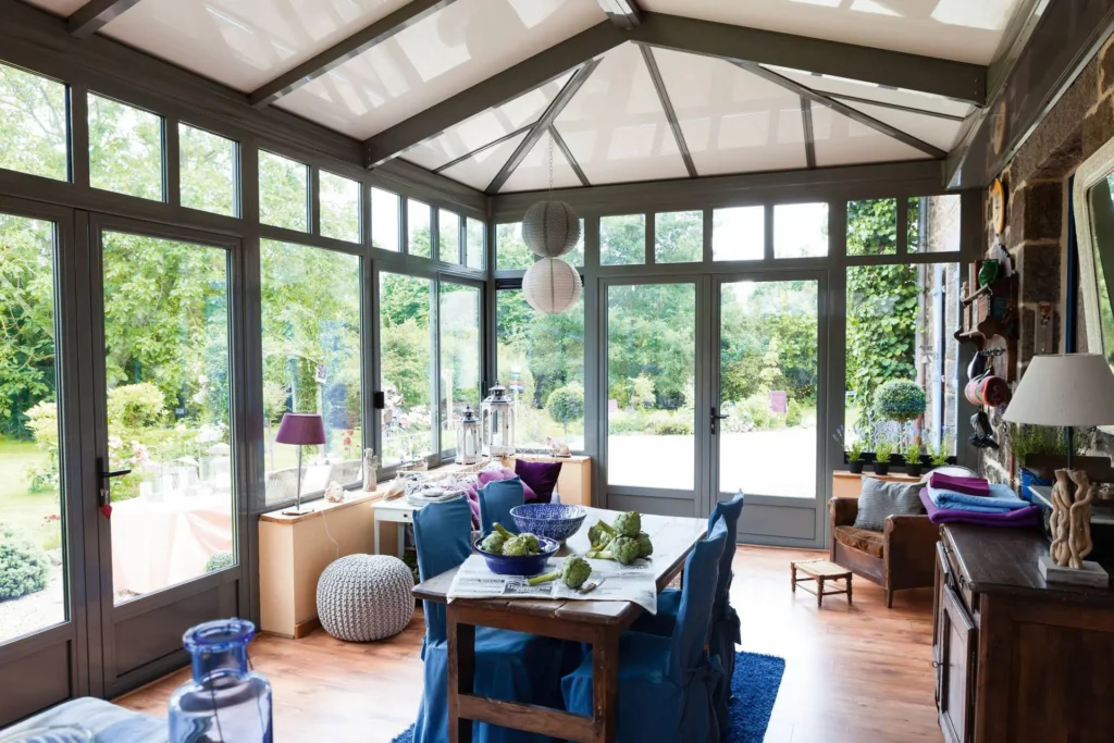 La véranda Esprit de Gustave Rideau au style moderne se démarque par sa corniche atypique et son design contemporain et graphique.